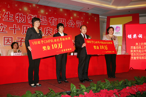 慶典會(huì)議在山東省泰安市福朋酒店舉行。本次慶典會(huì)議的參會(huì)嘉賓有中國(guó)輸血協(xié)會(huì)朱慶生理事長(zhǎng)、衛(wèi)生部醫(yī)政司血液管理處陳斌、泰安市副市長(zhǎng)周靜、王海燕副局長(zhǎng)、山東衛(wèi)生廳副廳長(zhǎng)襲燕、中國(guó)食品藥品檢定研究院生物制品檢定所所長(zhǎng)沈琦、中國(guó)醫(yī)學(xué)科學(xué)院輸血研究所所長(zhǎng)鄭忠偉等相關(guān)領(lǐng)導(dǎo),以及各省市醫(yī)療衛(wèi)生部門、各省市血液中心的主任等相關(guān)人員。慶典會(huì)議由山東泰邦王岢義副董事長(zhǎng)主持,會(huì)議開始前,在泰邦生物集團(tuán)高小英董事長(zhǎng)的帶領(lǐng)下,參會(huì)嘉賓一行來(lái)到山東泰邦的辦公樓和廠房參觀,共同鑒證并分享山東泰邦作為民族生物制藥企業(yè)在十年發(fā)展歷程中的進(jìn)取與收獲。明亮的辦公樓大廳墻壁上,一幅幅展示板圖文并茂的向參觀的嘉賓展示了山東泰邦十年發(fā)展歷程中取得的一個(gè)又一個(gè)驕人成績(jī)。