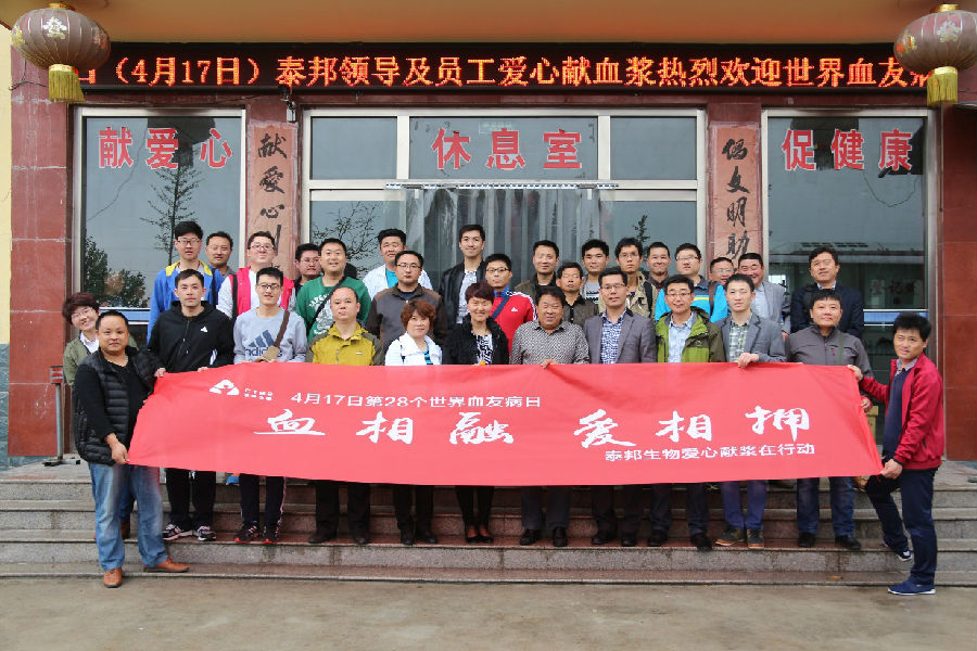 2016年4月16-17日,為迎接“第28個世界血友病日”的到來,山東泰邦生物制品有限公司組織員工五十余人到寧陽漿站舉行了捐獻血漿公益活動?;顒右?ldquo;血相融· 愛相擁”為主題,旨在以泰邦人的實際行動號召更多的愛心人士加入到獻漿隊伍,提高公眾對于血友病(凝血功能障礙遺傳性疾?。┑年P(guān)注度,喚起全社會對于血友病患者的關(guān)愛和支持。